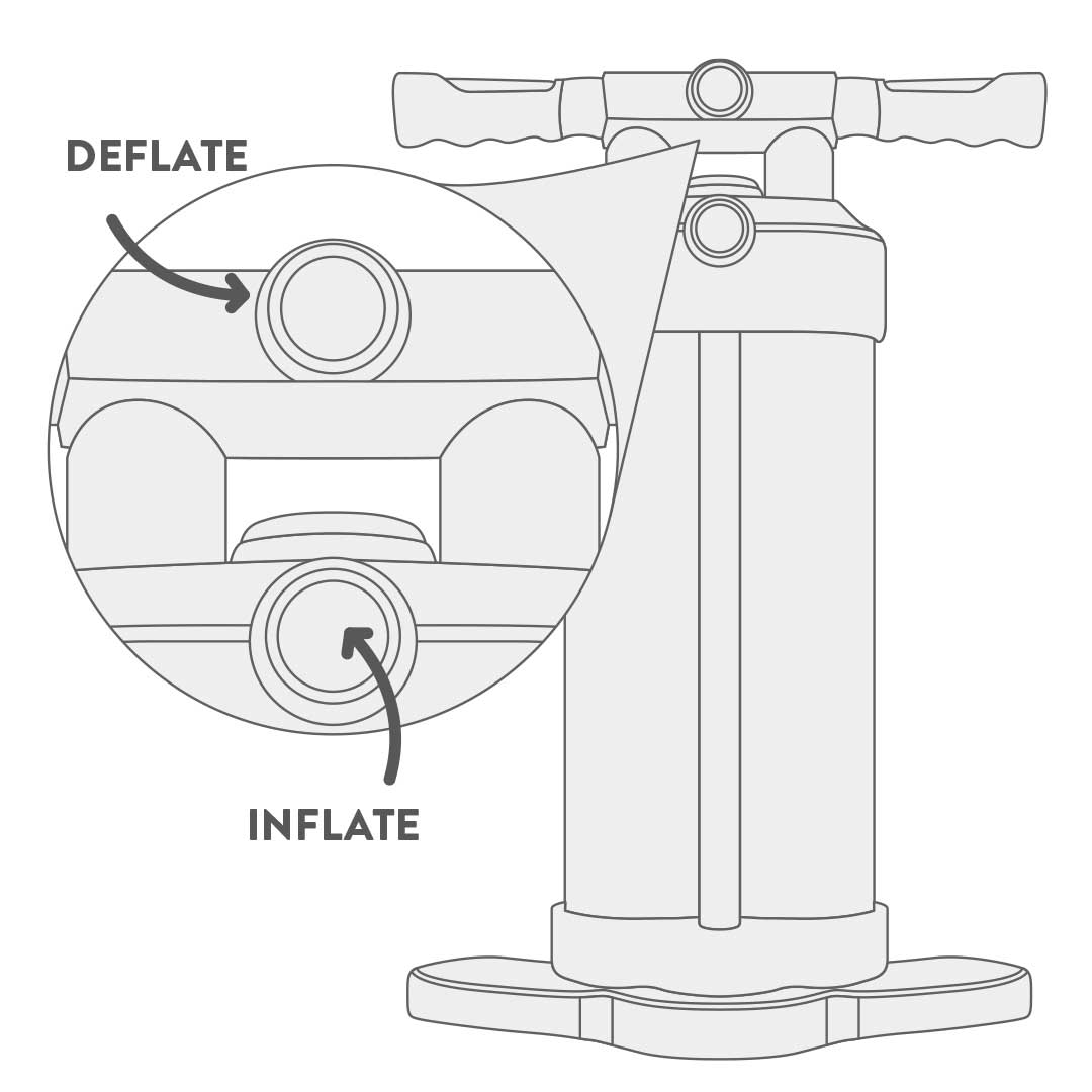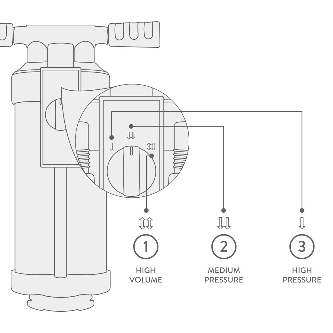 Change pumping modes with a flip of a switch! Ideally you'll start in HIGH VOLUME mode, pumping huge volume of air into the board on both the upstroke & downstroke.